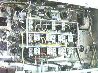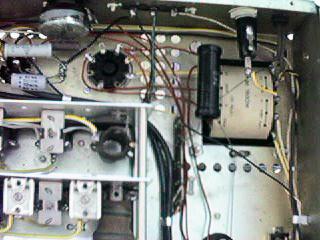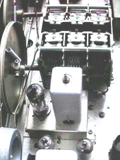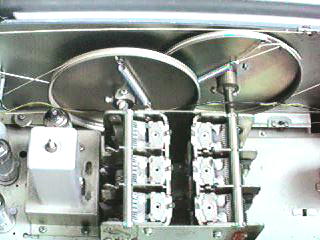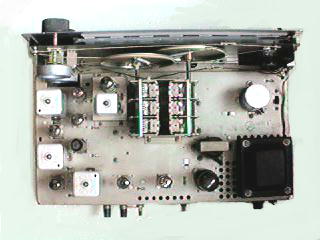 ![]() 上から見た全景です 大きなダイヤルホイールが左上に見えます 左側から下、右へ信号が流れます トランスの左に見える黒いのは整流管です |