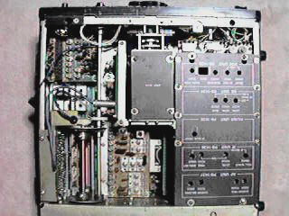 中央がVFOユニット、右側の黒いカバー内部がメインユニット回路基板の数数が内蔵されています