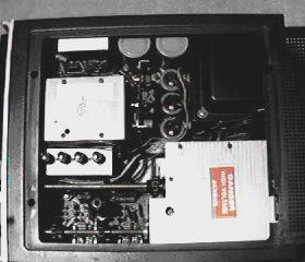 上部から見た内部です 左側が前面パネルとなっています 左側上にあるのがVFOユニットです 中央下の部分にファイナルユニットがあります 中にS2001×2が入っています 手前にドライバユニット(下左)となっています その上がVOXなどのコントロールユニットです |