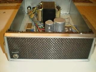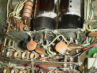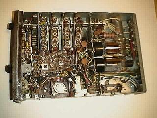 ケース内部上側 ファイナルが1本追加されている改造が判りますか? かなりの根性ある改造です 右下に見える小さな真空管がドライブの12BY7Aです 右上には小さなタンクコイルが見えます こんなもので |