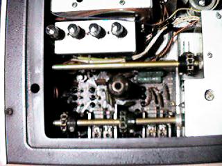 上部から見た内部です 左側が前面パネルとなっています 左側上にあるのがVFOユニットです 中央下の部分にファイナルユニットがあります 中にS2001×2が入っています 手前にドライバユニット(下左)となっています その上がVOXなどのコントロールユニットです |